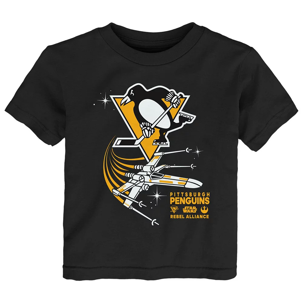 Make rooting for the Pittsburgh Penguins even more exciting for your young fan with this Rebel Alliance T-shirt. Its crew neck design and soft cotton fabric pair for a casual feel. Plus, distinct Pittsburgh Penguins and Star Wars graphics combine your kiddo’s two favorites into one neat design.