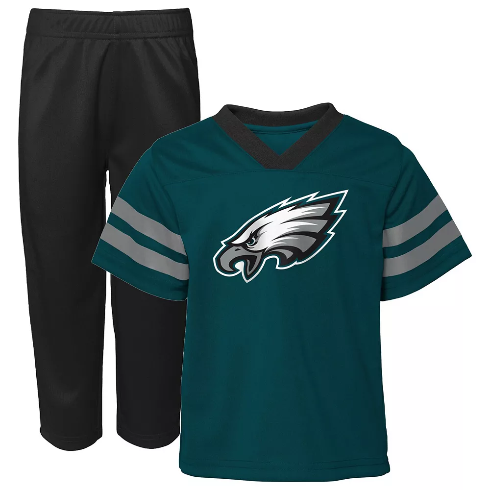 Prepare your little one for a lifetime of fandom with this Philadelphia Eagles Red Zone set. It includes a jersey and pants both decorated in signature Philadelphia Eagles colors and charming graphics. The top features a V-neck, and the bottoms offer an elastic waistband that stretches to a comfortable fit.