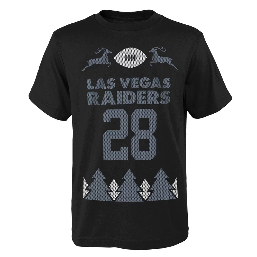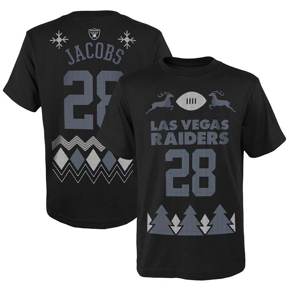 Josh Jacobs is ready to help celebrate the holidays with this Holiday Name and Number T-shirt. This festive Las Vegas Raiders tee features your kiddo’s favorite player, along with a holiday-inspired design that includes snowflakes and reindeer! Your young fan will be excited and properly prepared to support their team on game day this season when they have this soft T-shirt.
