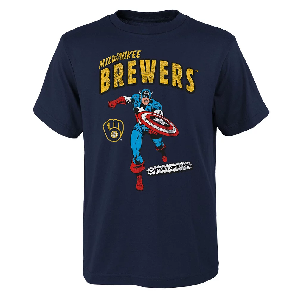 Combine your kiddo’s love for Captain America and their favorite squad with this Milwaukee Brewers Marvel T-shirt. It provides the ultimate casual feel with its classic crew design and soft fabric. Bold, spirited graphics give your young fan’s game day outfit a fun flair.