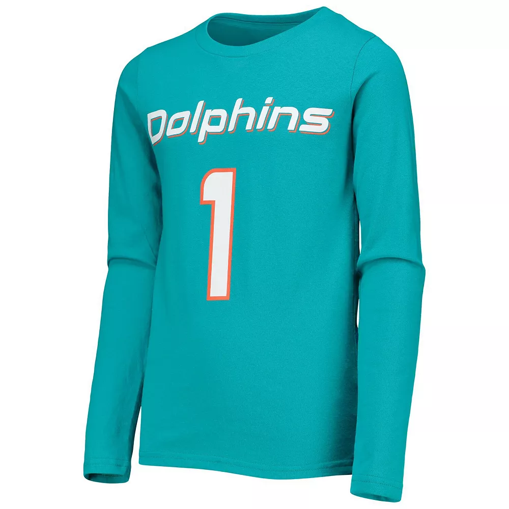 Your kiddo has steadily grown as a football fan, so help them showcase that strengthening pride with this Miami Dolphins Tua Tagovailoa Mainliner Player Name and Number T-shirt. It features crisp graphics and a snug, comfortable fit. When they show up to a team event with this electrifying cotton tee, no one will question who their favorite player is.